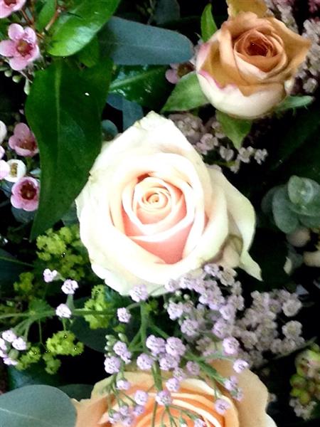 The Shirley is a Beautiful soft hand-tied bouquet in peachy shades. Bouquet pictured is the Standard size.